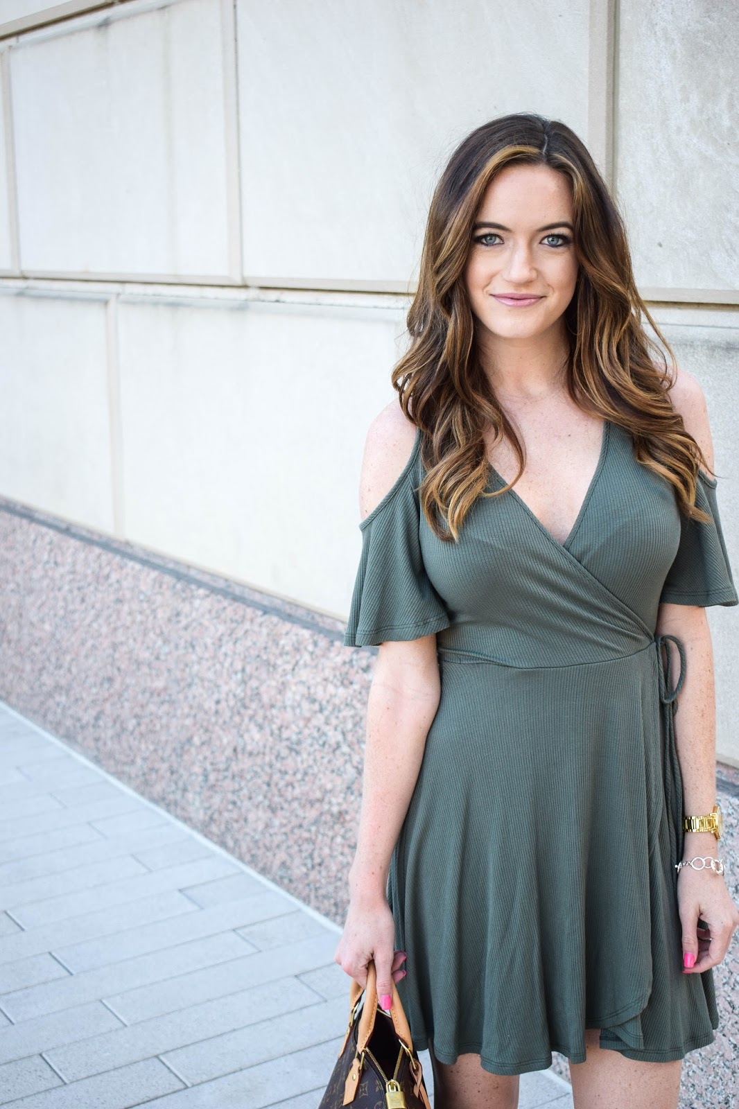 I was at Nordstrom last week (what’s new haha) and found this amazing olive green wrap dress! I don’t typically go for wrap dresses, but there were only a few left at this location so I figured I would give it a try. Side note: when there are only a few of an item left at a store I take that as a sign that it fits pretty well, especially if it is a new item. Anyways, tried this dress on and it was one of those where you try it on and you know you are going to have a hard time not wearing it at least once a week haha. This dress is extremely comfortable AND it hugs your body in all the right places (bonus!). I wish it came in more colors, because I would probably buy them all. The best part about this dress though? It’s only $45!