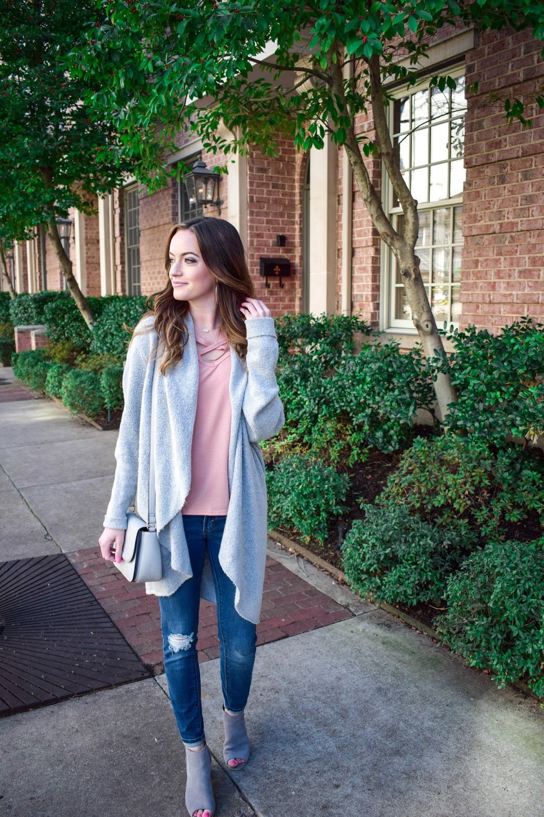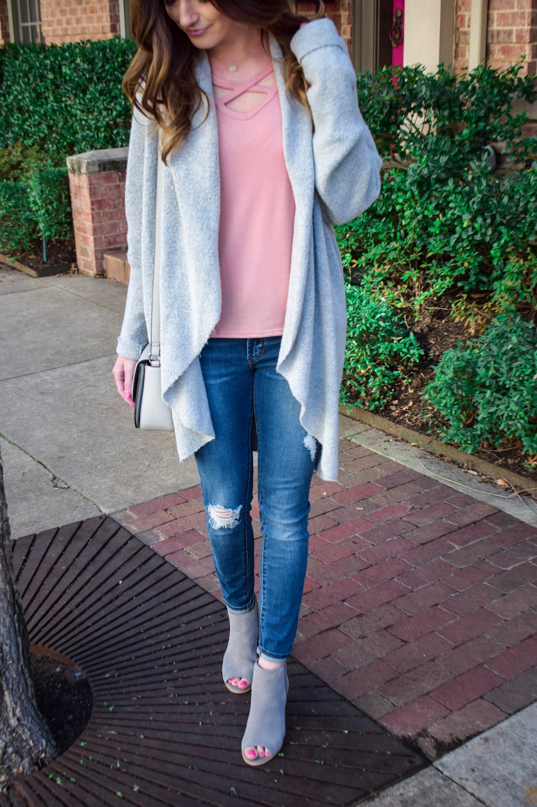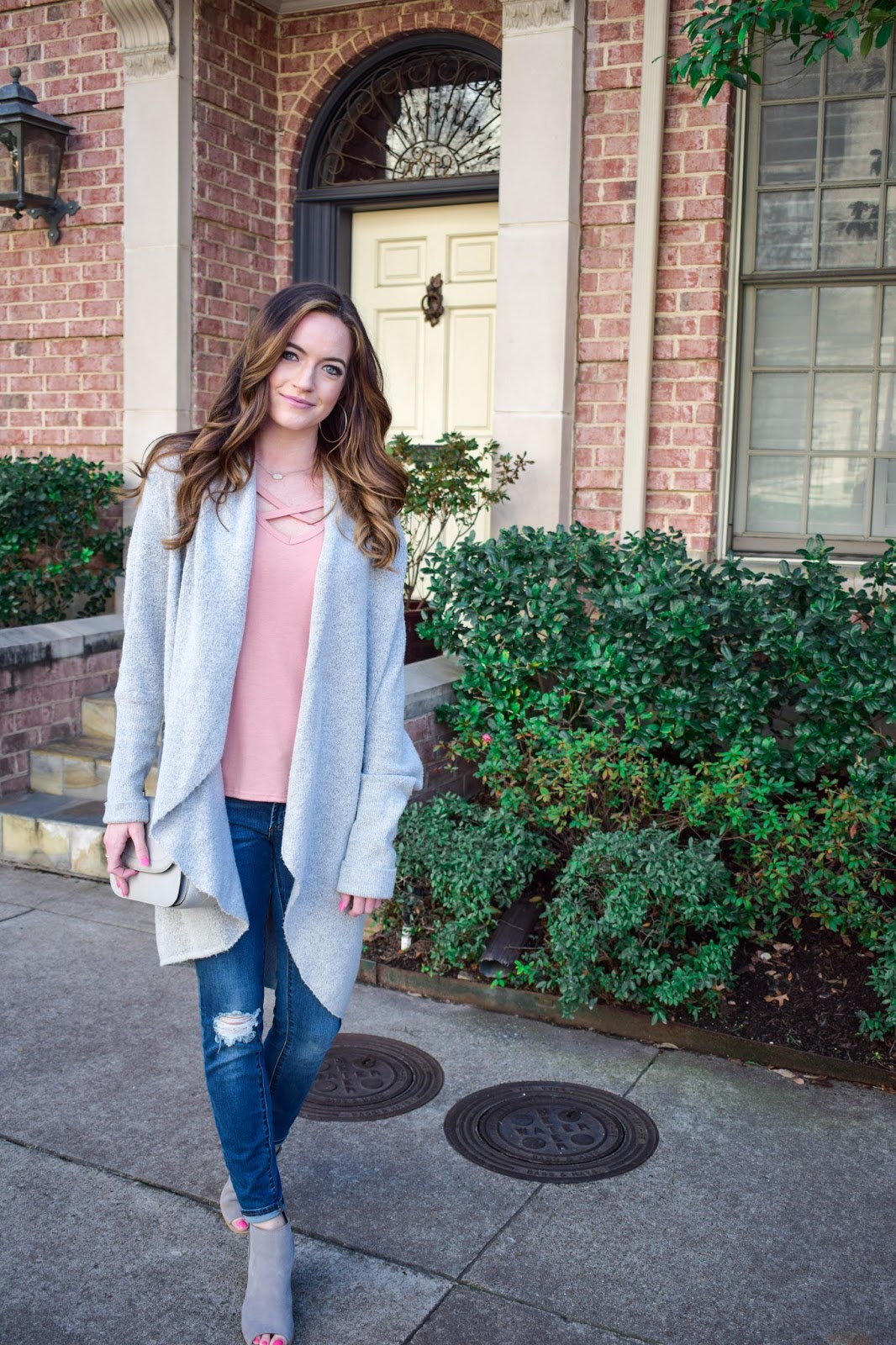I am never hesitant to add a good quality cardigan to my closet, because I truly think you can wear them year round in Texas (well, except for the scorching hot month of July). Maybe it is just me, because I am always cold, even when its 80 degrees outside. π Anyway, I tend to find the best cardigans either at Nordstrom or at Maude Boutique (visit here). Maude always has the best quality cardigans for the best prices. I still have some from a few years back that are in great condition and I wear them all the time. At Nordstrom, I have luck with the ones in the BP. section, as well as in the Free People section. I have linked a few ones below that i LOVE for a grey cardigan!